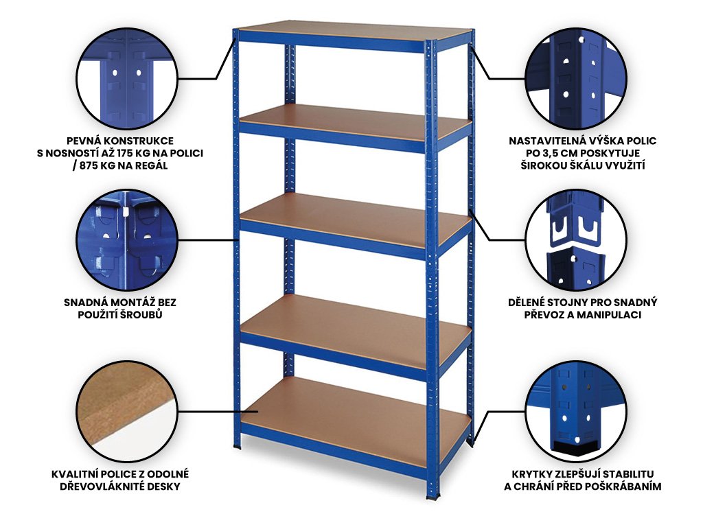Samotný regál neobsahuje žádný spojovací materiál. Jednotlivé díly není třeba vzájemně sešroubovat, k fixaci slouží kompatibilní aretační prvky regálu. Nemusíte tak složitě hledat spoustu nářadí, nezdržujete se šroubováním a dotahováním spojů a netrávíte hodiny skládáním regálu. Jedinou výjimkou, kdy budete používat šrouby a vruty, je uchycení již sestaveného regálu do zdi, příp. spojení více regálů k sobě. Tyto kroky výrazně přispějí k vaší bezpečnosti.