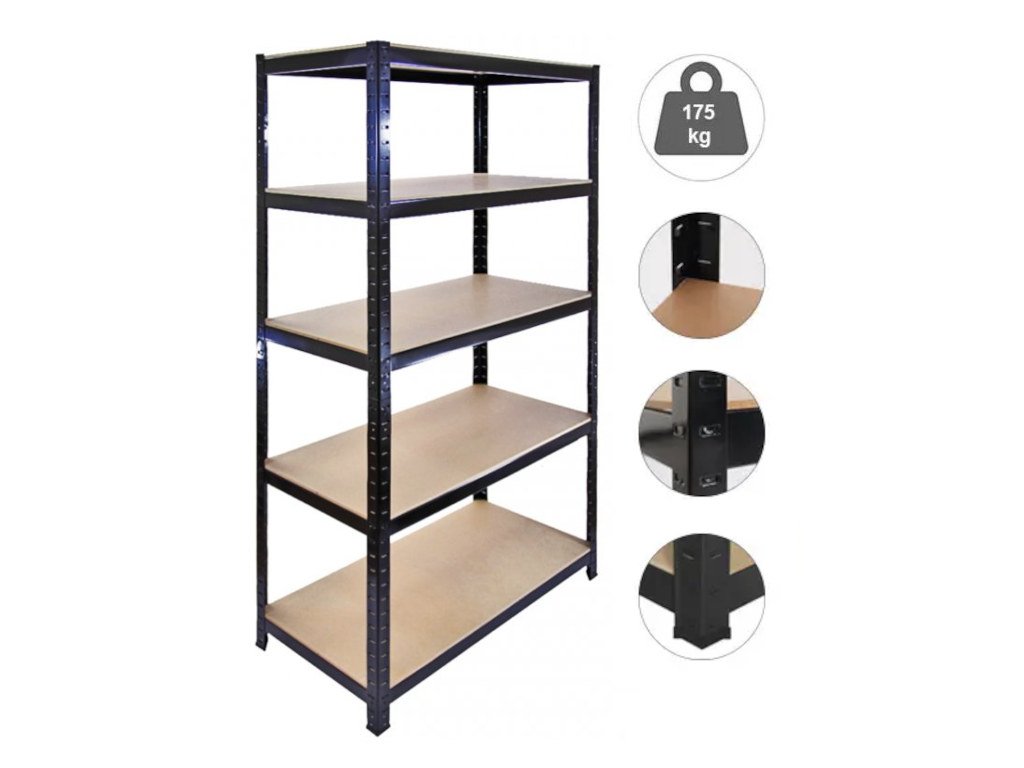 Regál 1800x1000x300 mm lakovaný 5-policový, nosnost 875 kg - ČERNÝ