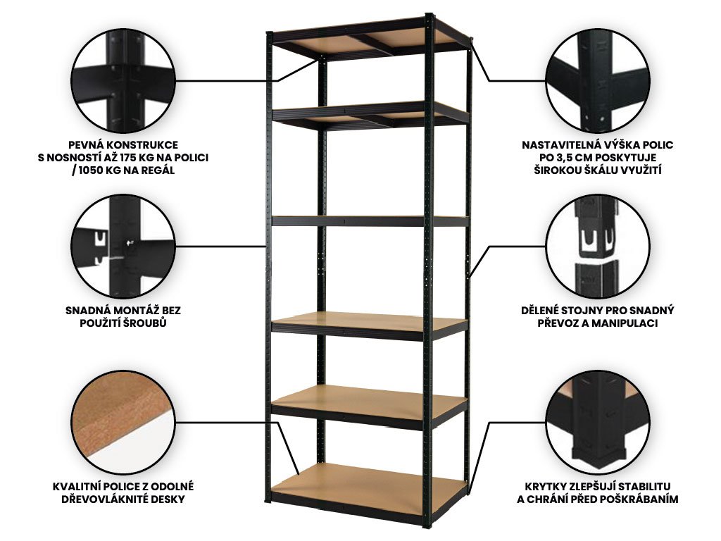 Regál standardního typu s nosností až 175 kg na polici najde využití jak v domácnosti, tak v kanceláři nebo menším skladu. Zajistí přehledné uskladnění zboží, dokumentů nebo nářadí a ušetří místo. Kvalitní materiál a bytelná konstrukce zajistí dlouhou životnost a odolnost vůči poškození. Zároveň je jeho montáž velmi snadná a sestavení regálu nezabere celé odpoledne.