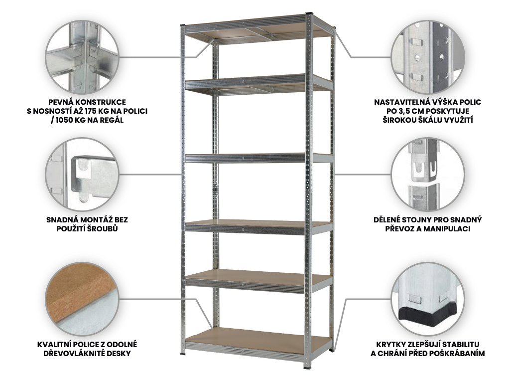 Regál standardního typu s nosností až 175 kg na polici najde využití jak v domácnosti, tak v kanceláři nebo menším skladu. Zajistí přehledné uskladnění zboží, dokumentů nebo nářadí a ušetří místo. Kvalitní materiál a bytelná konstrukce zajistí dlouhou životnost a odolnost vůči poškození. Zároveň je jeho montáž velmi snadná a sestavení regálu nezabere celé odpoledne.