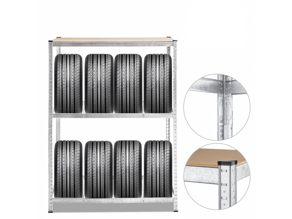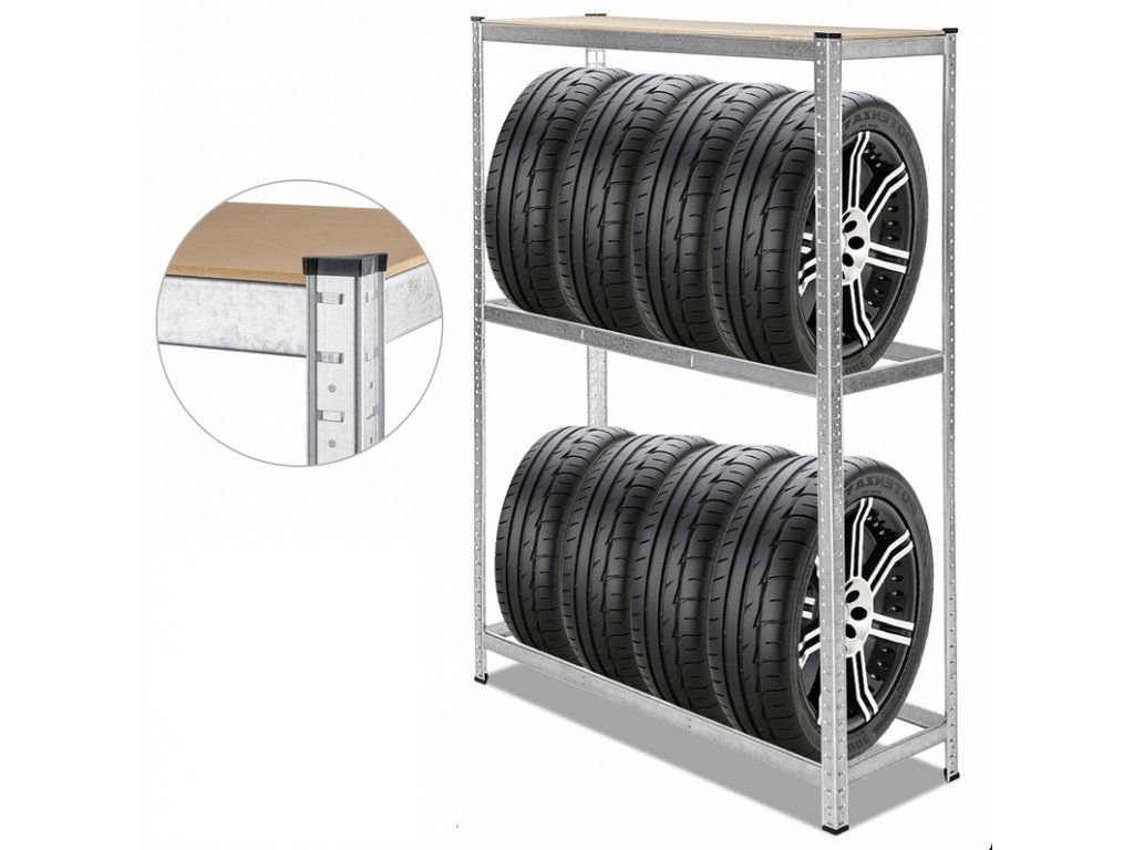 Pozinkovaný regál na pneumatiky je praktickým řešením, když chcete uložit pneumatiky, ráfky nebo nářadí. Hodí se nejen do skladů a dílen. Kromě toho má regál na pneumatiky další polici vyrobenou z MDF dřeva pro uložení například nářadí nebo ráfků. Speciálně zaoblené kovové profily zajišťují optimální uložení pneumatik, nemají ostré hrany a nevytvářejí žádné tlakové body. Dvě úrovně pneumatik a horní police jsou vyztuženy přídavnou vzpěrou a nabízejí tak dostatečný prostor a stabilitu pro větší nebo těžší pneumatiky.