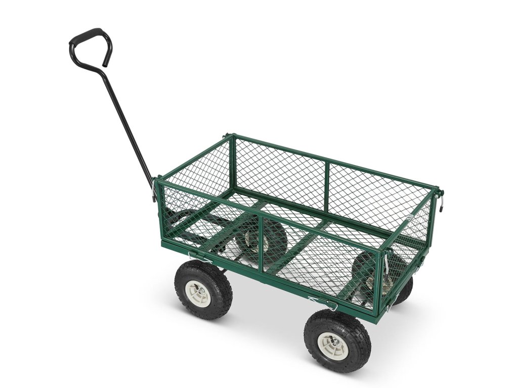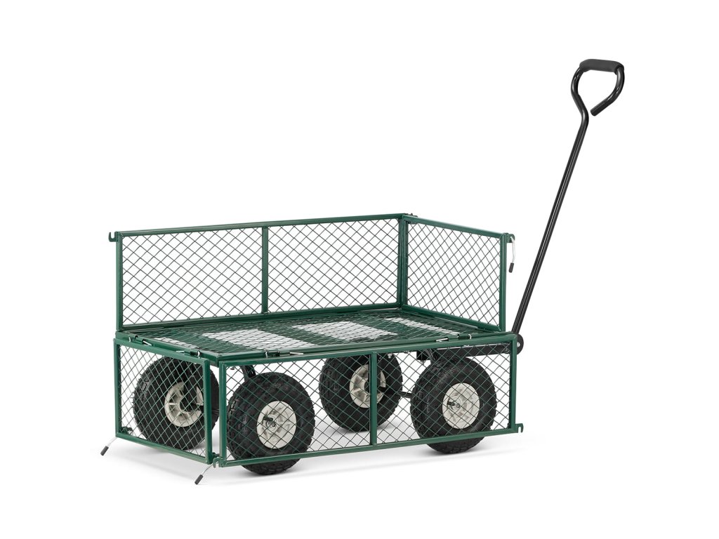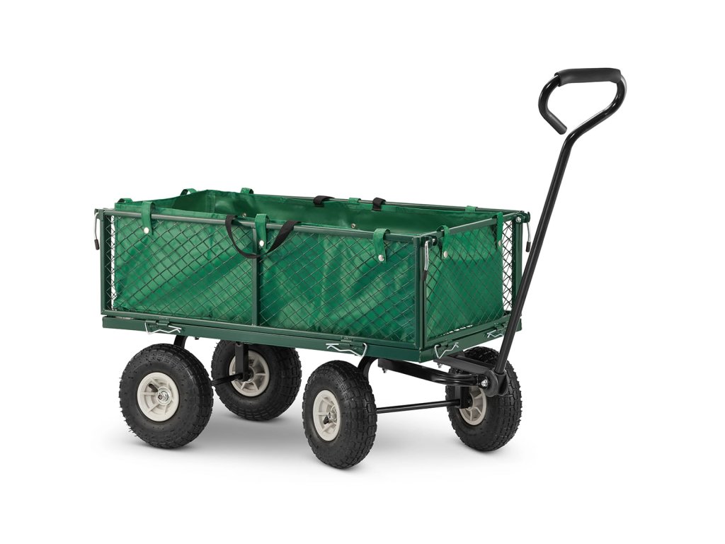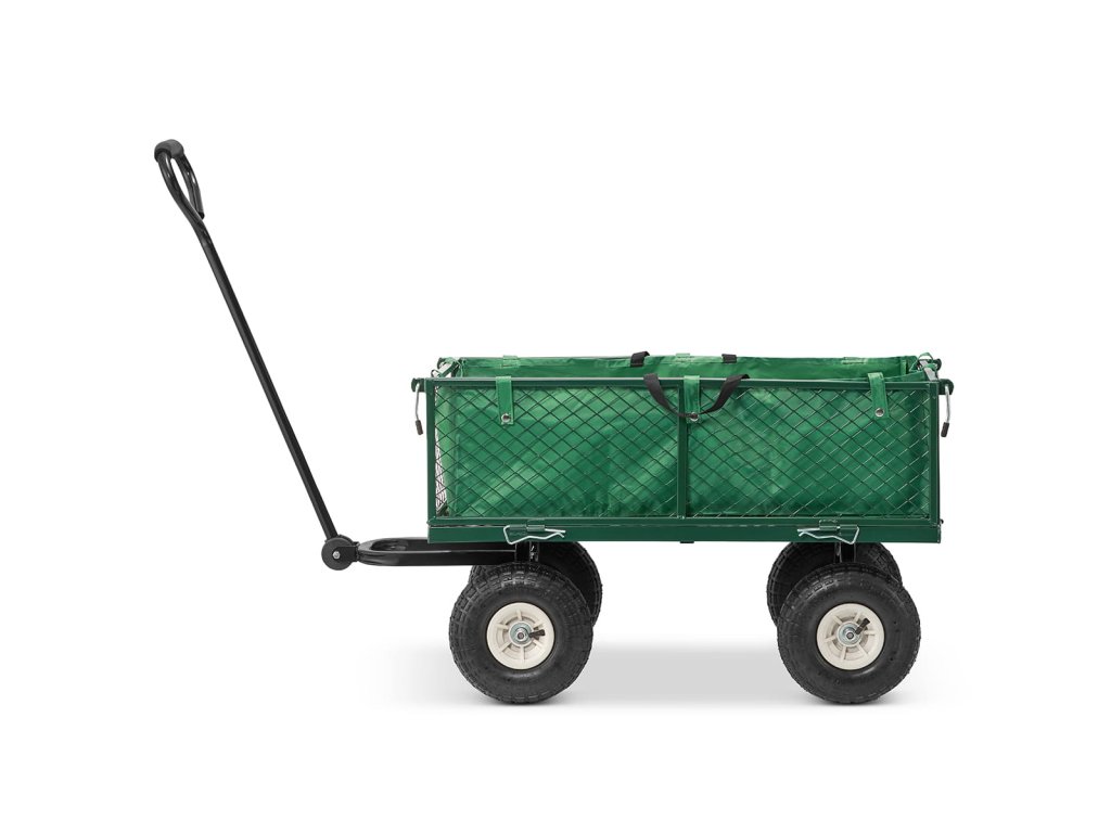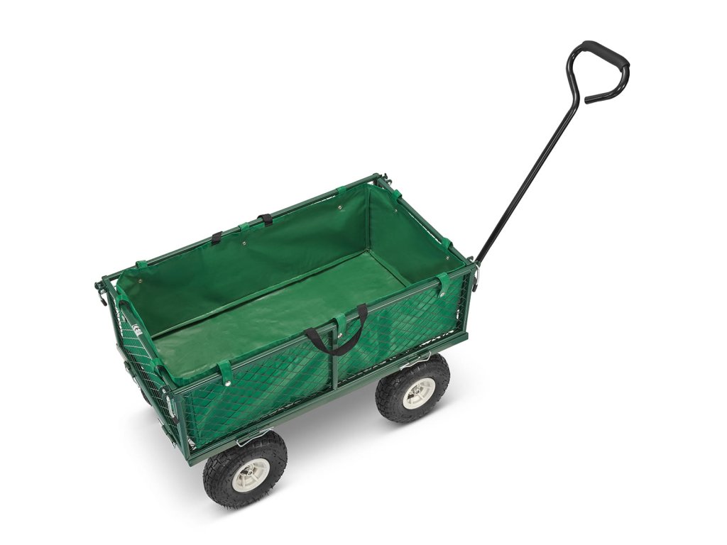 Je vyroben z pevných ocelových profilů a kvalitního pletiva. Vedle toho je osazen koly, které můžete zatížit až 450 kg. Pro případ potřeby transportu sypkého či drobnějšího materiálu je vozík dodáván s látkovou výplní.