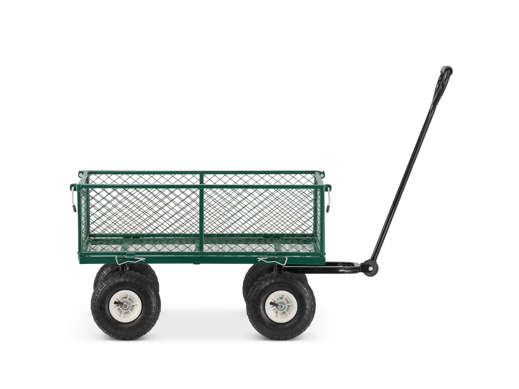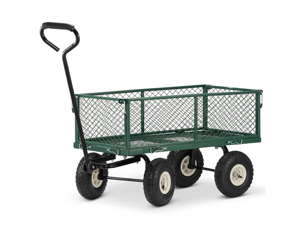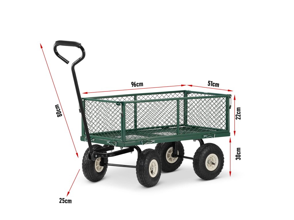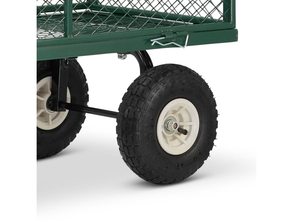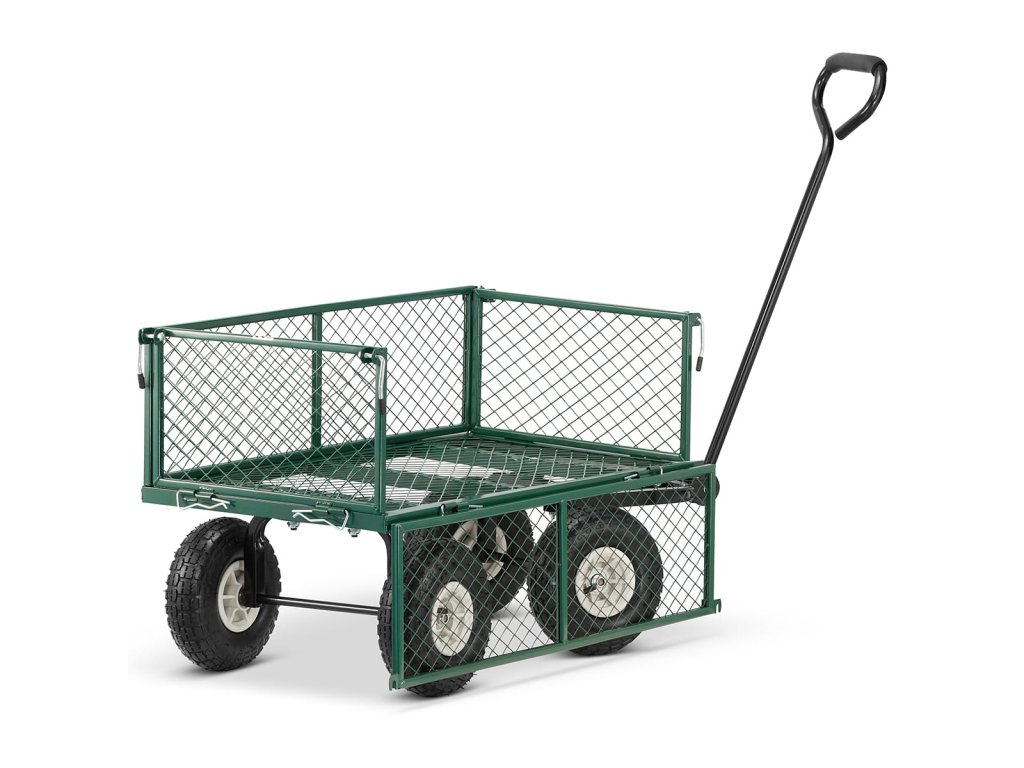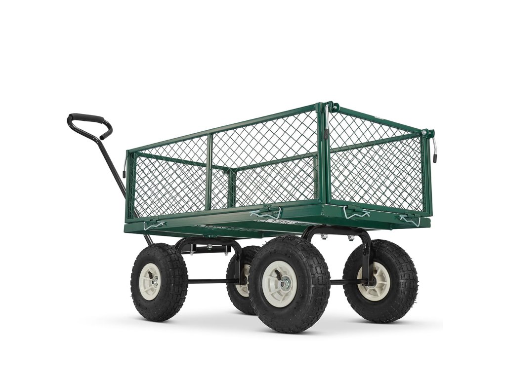 Je vyroben z pevných ocelových profilů a kvalitního pletiva. Vedle toho je osazen koly, které můžete zatížit až 450 kg. Pro případ potřeby transportu sypkého či drobnějšího materiálu je vozík dodáván s látkovou výplní.